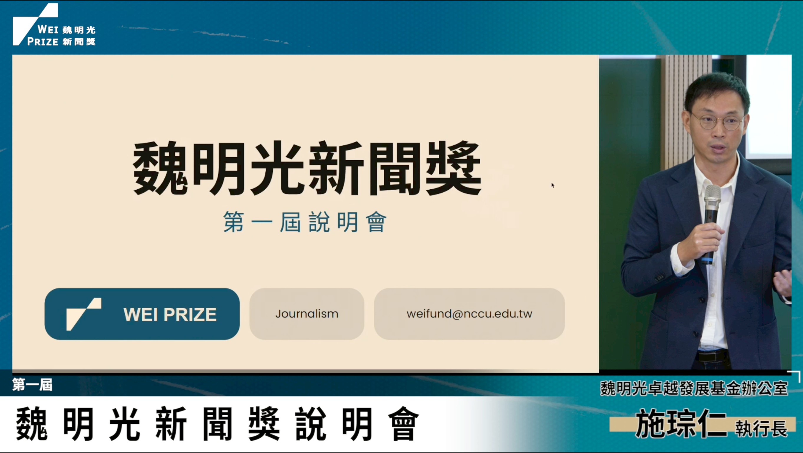 「第一屆魏明光新聞獎」於 11 月 7 日舉辦實體徵件說明會,活動在政治大學公企中心熱烈登場,並同步開放線上直播,吸引近 30 位來自各大媒體機構與新聞實務領域人士出席。若加上 10 月 28 日舉行的首場線上說明會,兩場活動共吸引近 60 位新聞與傳播工作者參與,展現出社會各界對台灣新聞環境與專業發展的關注。